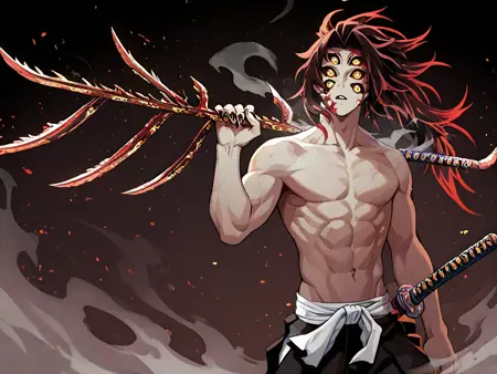 | 학습된 단어 | kokushibou, 1boy, male focus, muscular male, topless male, forehead mark, facial tattoo, grey skin, colored sclera, narrow waist, hakama,복사됨! holding katana, branched sword, sheath,복사됨! moon breathing, crescent, zouri,복사됨! fighting stance, broken ground, shockwave, indoors, ceiling, floor, steam, dust,복사됨! fog, dark, night, shadow, dim lighting, wooden pillar, endless basement, black background,복사됨! tusks, fangs, veins, biceps, pectorals, clenched teeth, shaded face, shaded eyes, silhouette demon, demon horns, sharp fingernails,복사됨! motion blur, motion lines, emphasis lines, speed lines, from below, low angle, dutch angle, full body, wide shot, no humans, scenery,복사됨! |