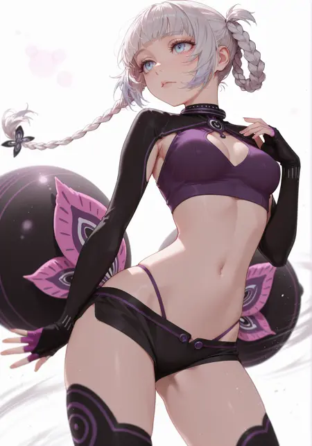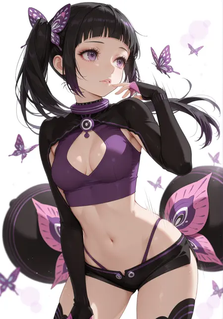 小乳房、乳房、中等乳房、肚脐、乳沟、腹部、腹部露肤、露胸剪裁、-衬衫、长袖、手套、黑色手套、肘部手套、露指手套、露脐装、服装剪裁、紫色手套,