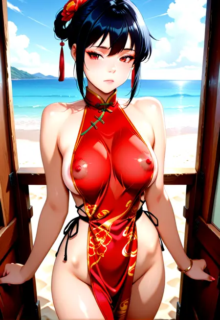 - breasts,chinese clothes,china dress,red dress,sideless outfit,bare shoulders,jewelry,pelvic curtain,areola slip,no panties,side slit,