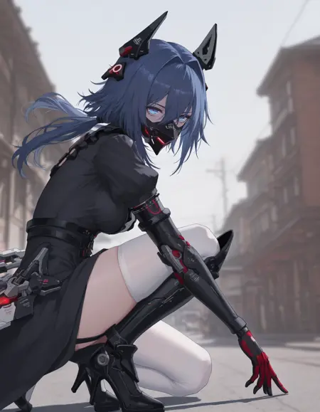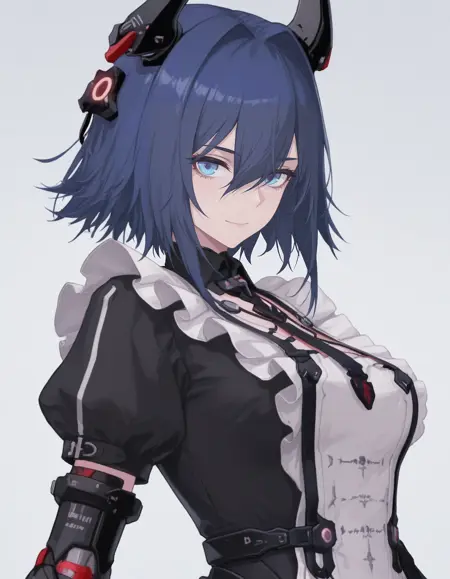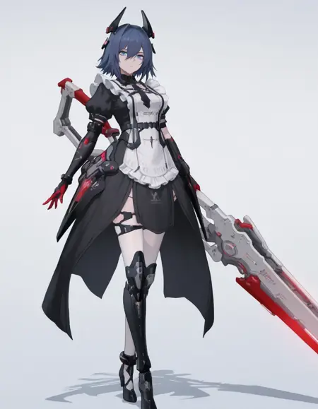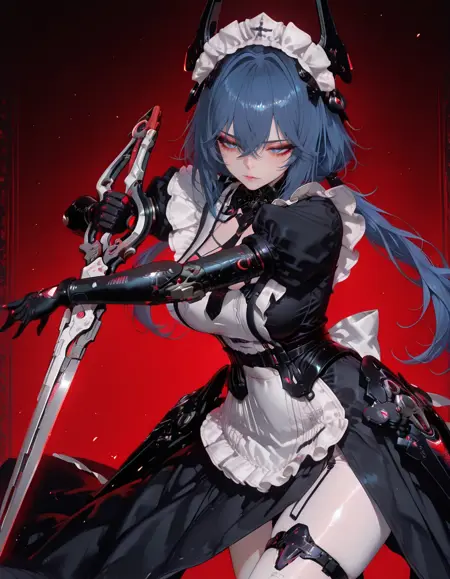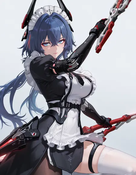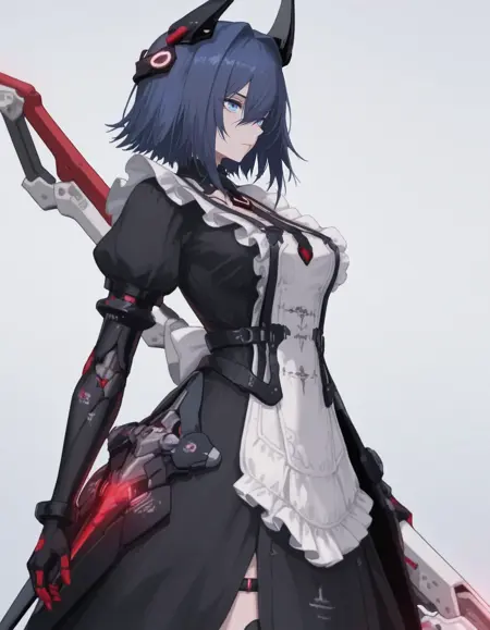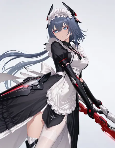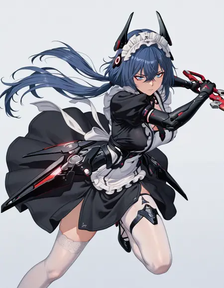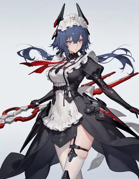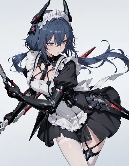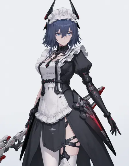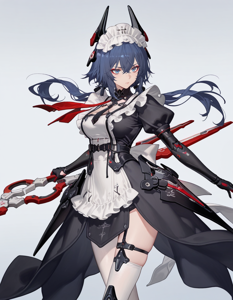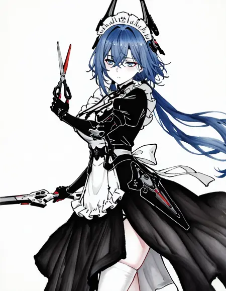 mai_pgr_concerto_cl,1girl,short_hair,blue_hair,crossed_bangs,hair_between_eyes,blue_eyes,headgear,black_dress,maid_apron,puffy_sleeves,maid headdress,mechanical_arms,black_gloves,single_leg_pantyhose,white_thighhighs,holding_scissors,low_twintails