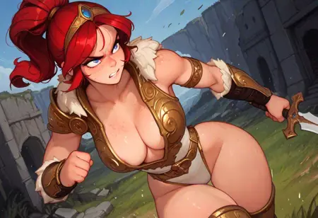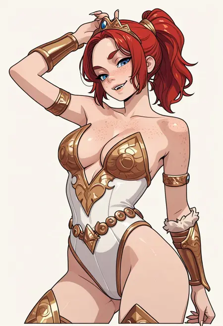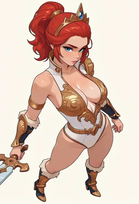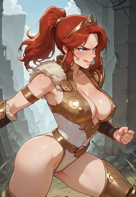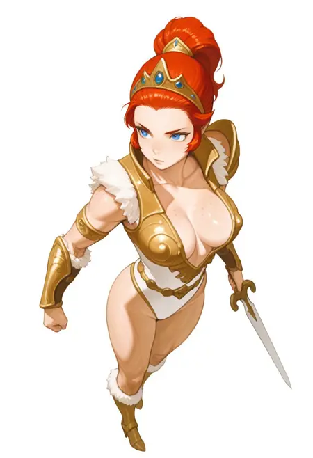 | 训练词汇 | , 1girl, solo, motu, teela, blue eyes, folded hair, red hair, ponytail, long hair, tiara, body freckles, collarbone, large_breasts, bare arms, bare shoulders, gold belt, armlet, gold_trim, (highleg leotard:1.5), white leotard, cleavage, plunging neckline, vambraces, greaves, single_pauldron, high_heel_boots, fur trim, gold breastplate, faulds, Armor, (No bra:1.6) , armor, full armor, bikini_Armor, 已复制! Teela, short hair, hair pulled back, blue eyes, golden Crown, high collar, golden breastplate, white leotard, golden armlet, White arm guards, fur-trimmed boots, knee boots 已复制! Teela, short hair, hair pulled back, blue eyes, golden Crown, high collar, golden breastplate, fur-trimmed shoulders, fur-trimmed sleeves, cleavage, white leotard, belt, golden armlet, golden bracer, fur-trimmed bracer, fur-trimmed boots, knee boots 已复制! holding shield, holding sword, holding staff 已复制! |