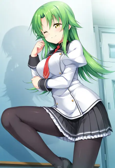 학교 유니폼, 빨간 넥타이, 흰 셔츠, 긴 소매, 검은 칼라, 검은 소매 끝, 검은 치마, 주름 치마, 검은 팬티후스,
