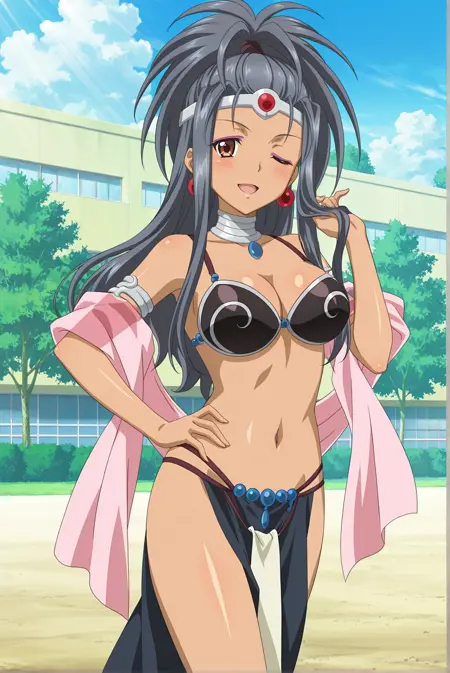 복장: shuriya, 댄서, 1girl, 갈색 눈, 회색 머리, 긴 머리, 높은 꼬리, 원형 머리장식, 메이크업, 검은 피부, 검은 피부를 가진 여자, 목걸이, 보석, 비키니 갑옷, 가슴, 배꼽, 골반 커튼
