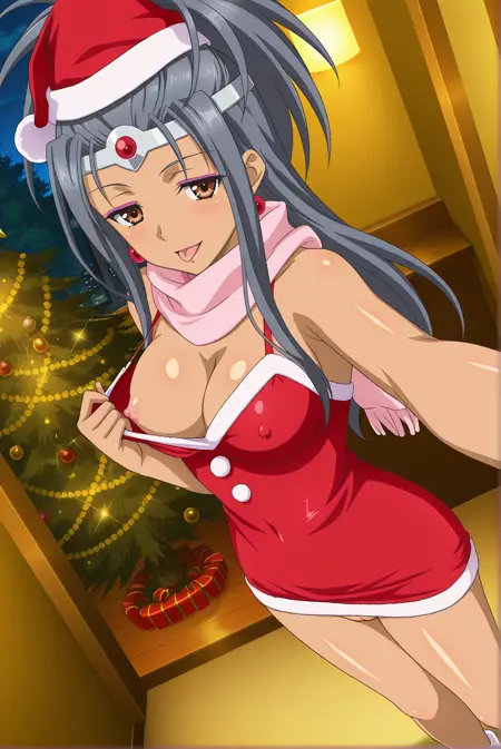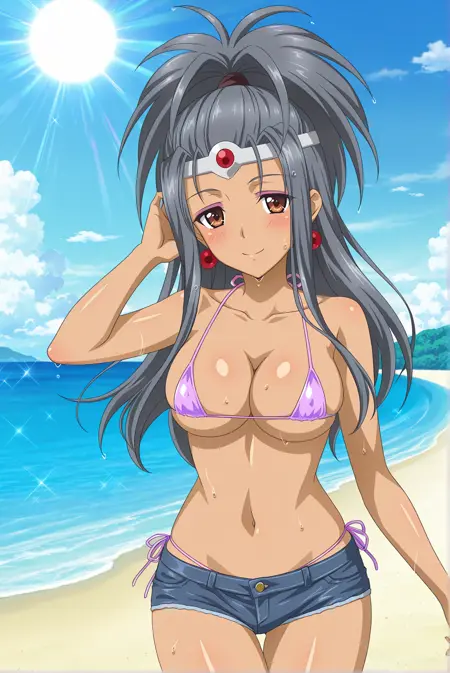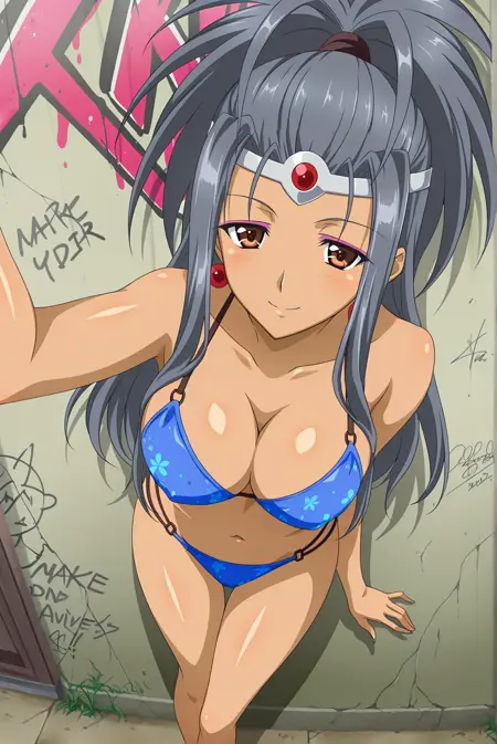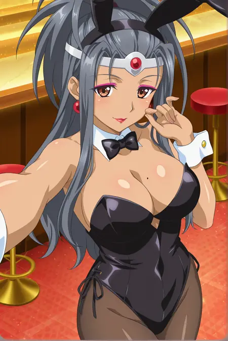 기본: shuriya, 1girl, 갈색 눈, 회색 머리, 긴 머리, 높은 꼬리, 원형 머리장식, 메이크업, 검은 피부, 검은 피부를 가진 여자