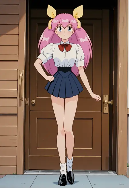 黄色のヘアーボウ, 学校制服, 赤いネクタイ, ポロシャツ, フリル付き短袖, ポロシャツをスカートにイン, プリーツスカート, 白い靴下, 黒いローファー