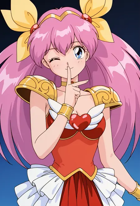 magical girl, yellow hair bow, yellow choker, shoulder pads, armor, wing brooch, heart brooch, bracelet, skirt, thighlet, red strappy heels