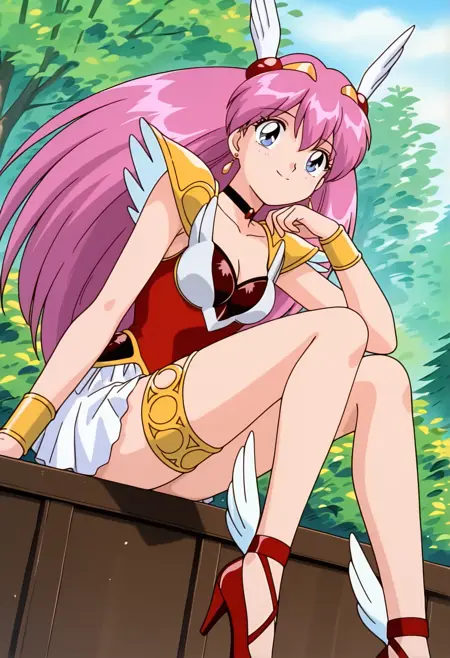 magical girl, head wings, hair ornament, earrings, choker, shoulder pads, armor, cleavage, bracelet, white skirt, thighlet, red strappy heels, winged footwear