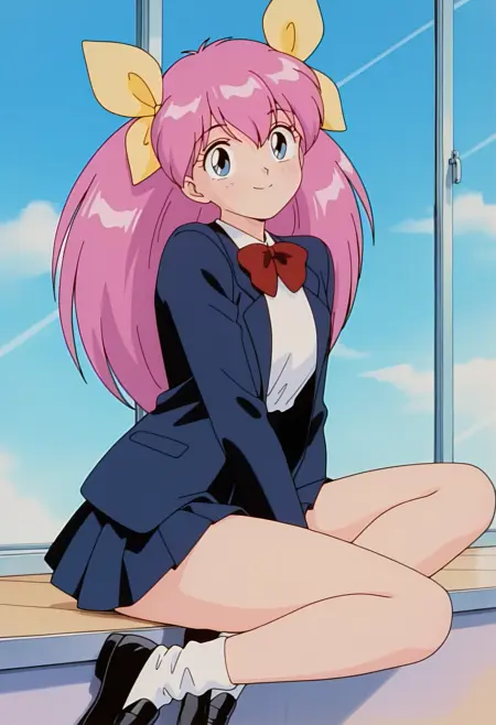 黄色のヘアーボウ, 学校制服, ブレザー, 長袖, 赤いネクタイ, プリーツスカート, 白い靴下, 黒いローファー