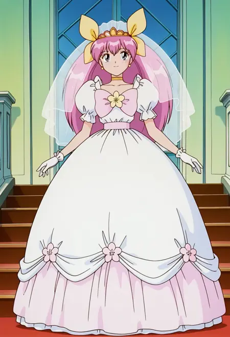 マジカルガール, 黄色のヘアーボウ, ティアラ, 婚礼のヴェール, ピアス, 黄色のチョーカー, ウェディングドレス, フリル付き短袖, ピンクのリボン, 白い手袋, 長いスカート