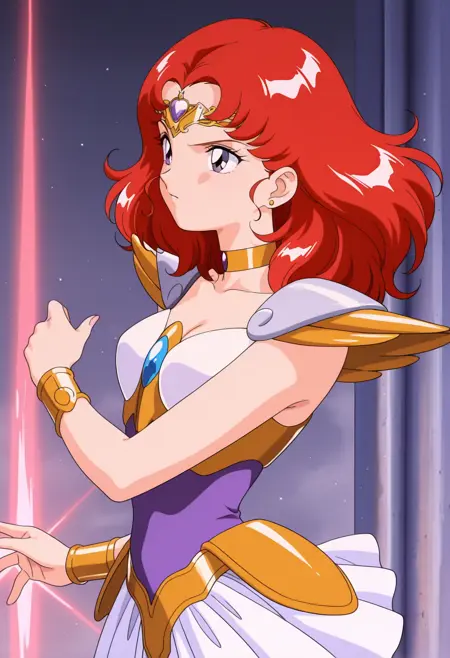 magical girl, tiara, stud earrings, choker, jewelry, shoulder armor, armored dress, bracelet, white skirt, thighlet, purple footwear