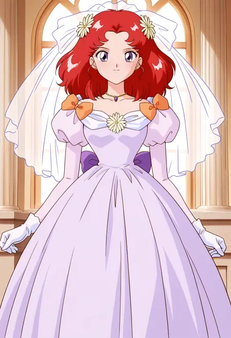 magical girl, hair flower, bridal veil, stud earrings, necklace, wedding dress, puffy short sleeves, orange shoulder bow, white gloves, purple waist bow, long skirt
