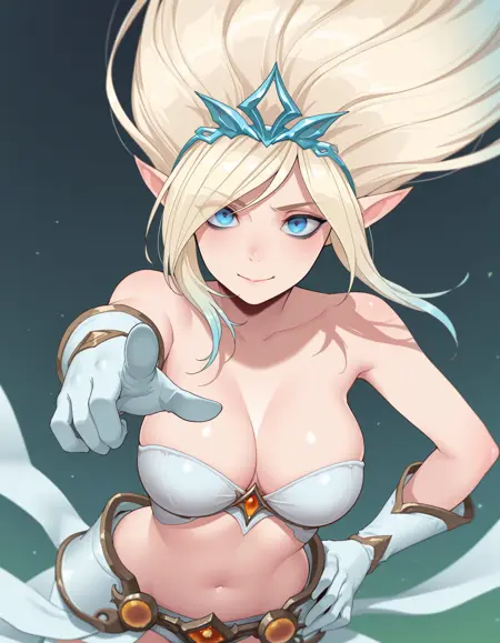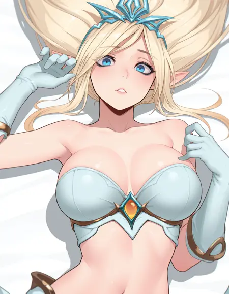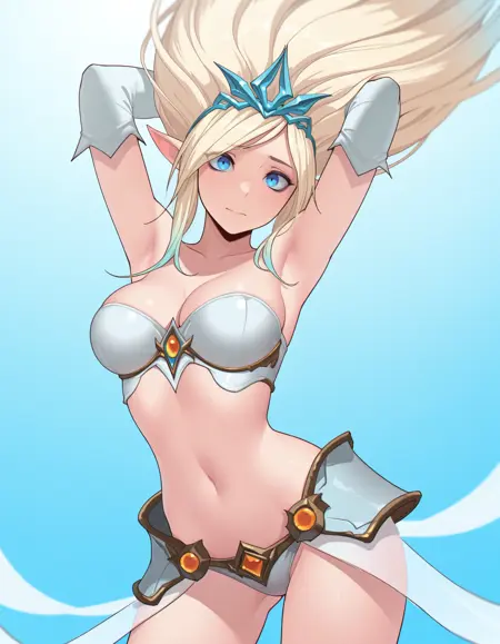 League of Legends衣装のタグ: "janna, 青い目, 皇冠, ハンガーなしブラ, へそ, 肩出し, 手袋, 足甲, 裸足"