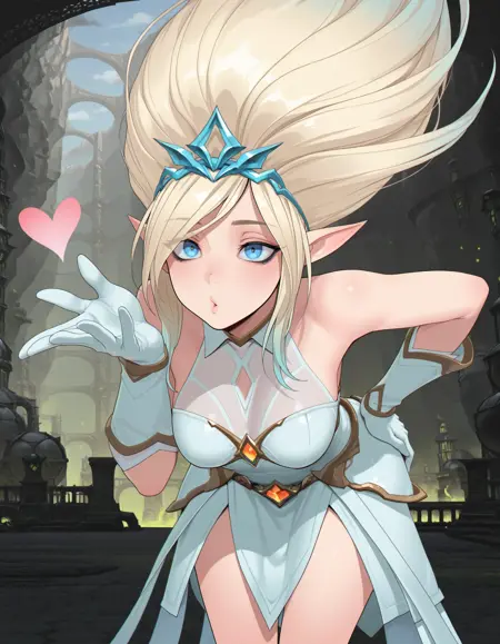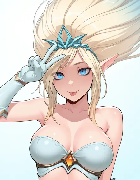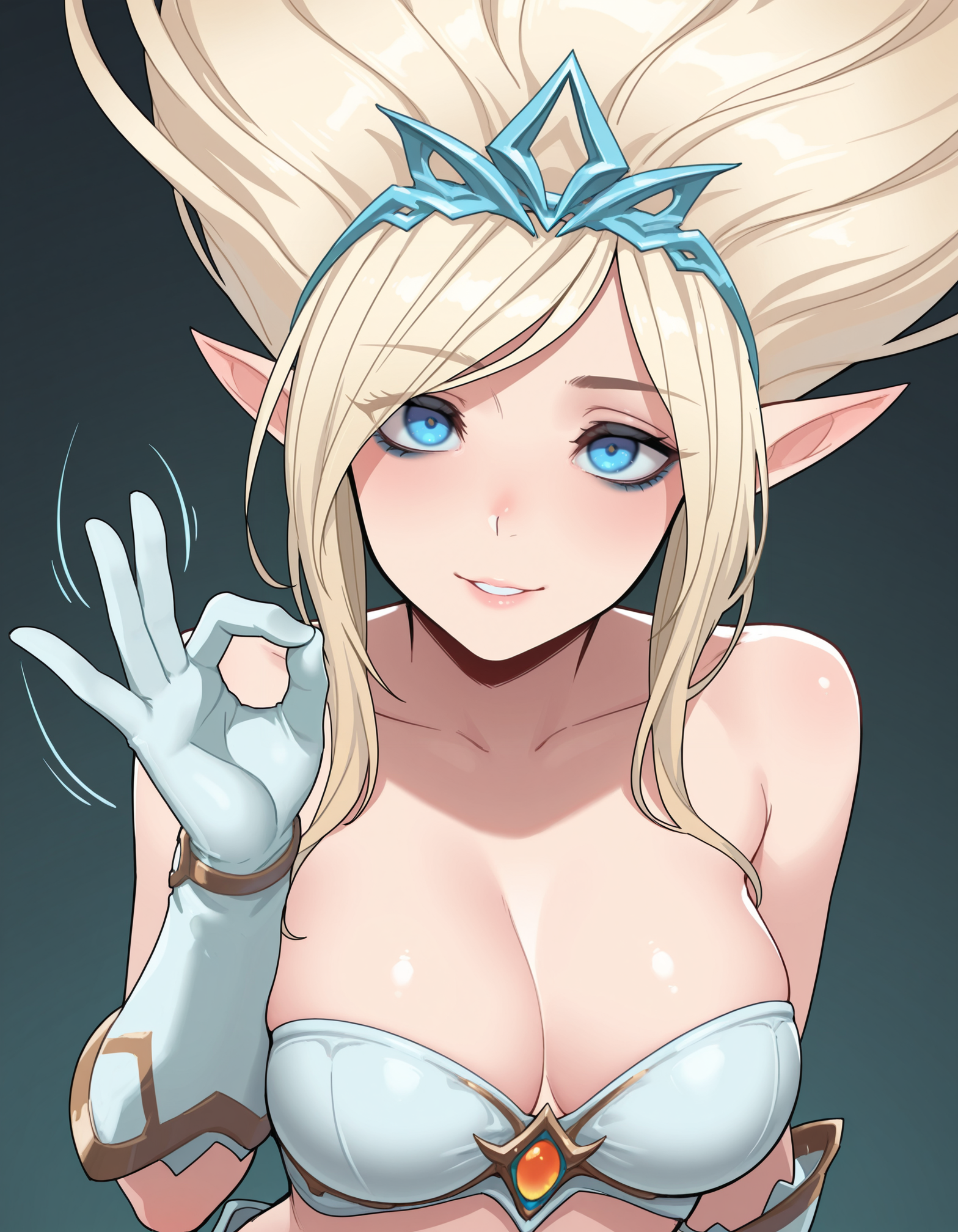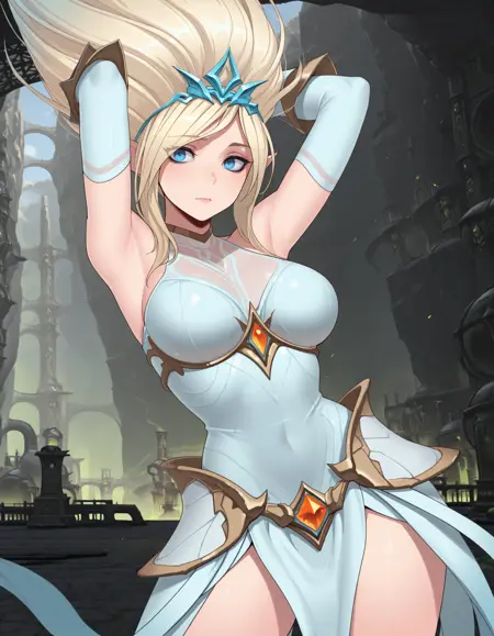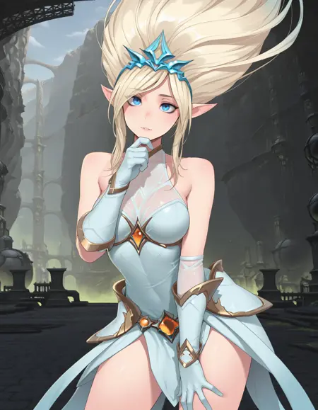 Wild Rift衣装のタグ: "janna, 青い目, 皇冠, ハイネckドレス, 肩出し, 手袋, 足甲, 裸足"