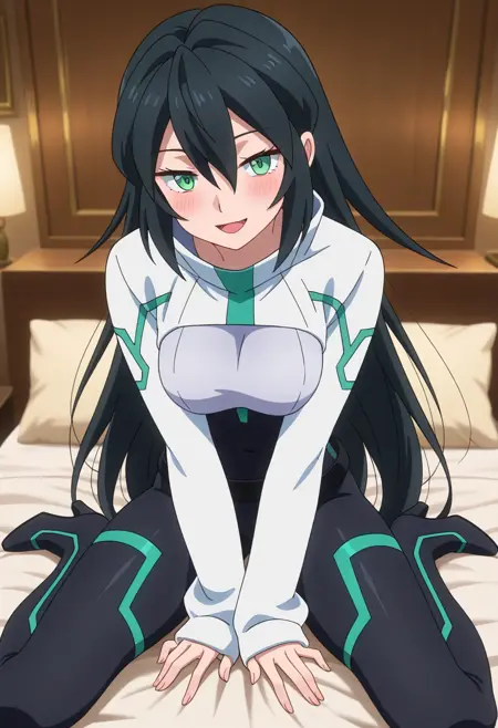 - _白いジャケット, シャラ (衣類), 黒のボディスーツ, 長袖, 袖が手首より長い, ハイヒール,