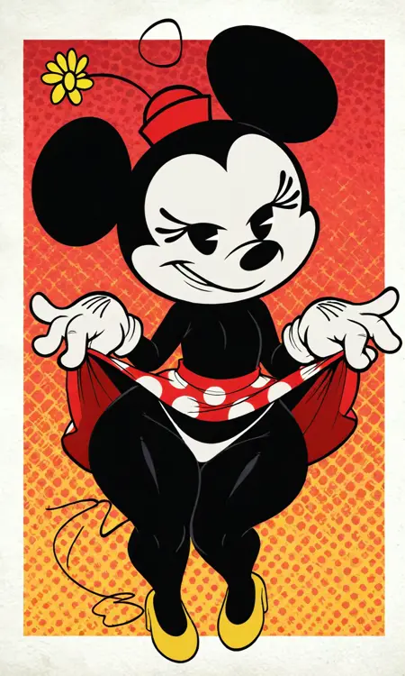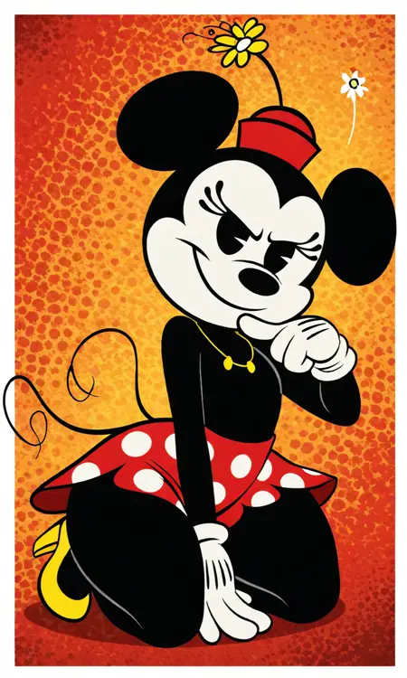 タグ:ミニー・マウス、黒い目、丸い耳、赤い小さな帽子、赤いスカート、白い手袋、黄色いヒール、4本指