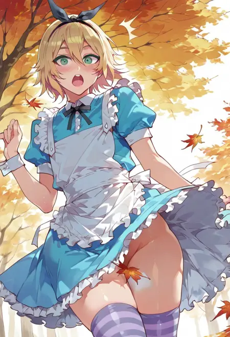 col: ((かわいらしいフリル付き白エプロン、フリル付き白スカート縁の可愛い青いドレス、黒リボンネクタイ、リボン付き黒ヘアバンド、ふくらはぎの袖、濃い紫と薄い紫のストライプのタイツ、白いディスパッチ手袋、)) ギャルリーな黒い靴、