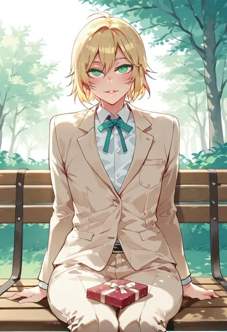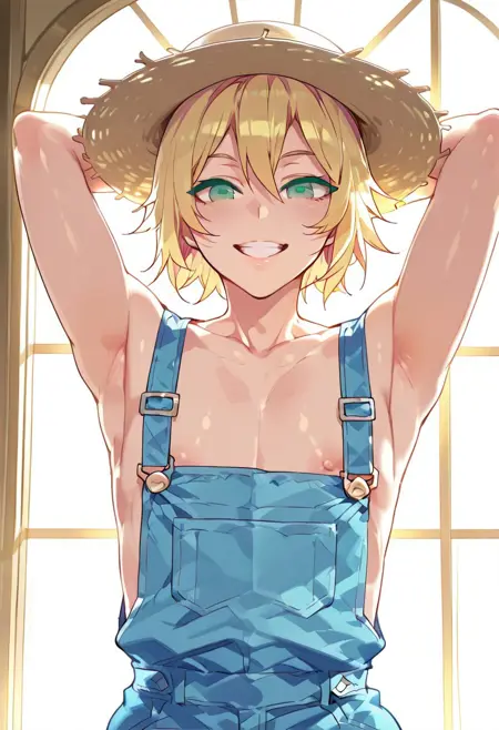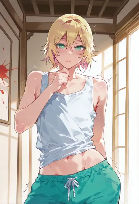 col: (( lora:traplice:1 、traplice、美しい緑の目、クリアな目、明るい瞳孔、美しい目、美しい金髪、美しいショートヘア、乱れた前髪、かわいらしい少女系男性、細いウエスト、広い hips、美しい肌、自然な美しさ、異彩を放つ美しい少女系男性、魅力的な少女系男性、))