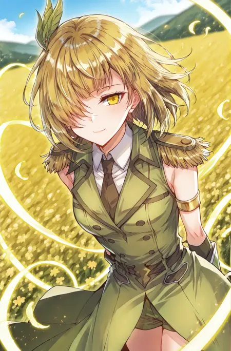 Mengdi, 1 girl, solo, short hair, yellow hair, hair covering one eye, long side bangs, yellow eyes, white wing hair ornament,