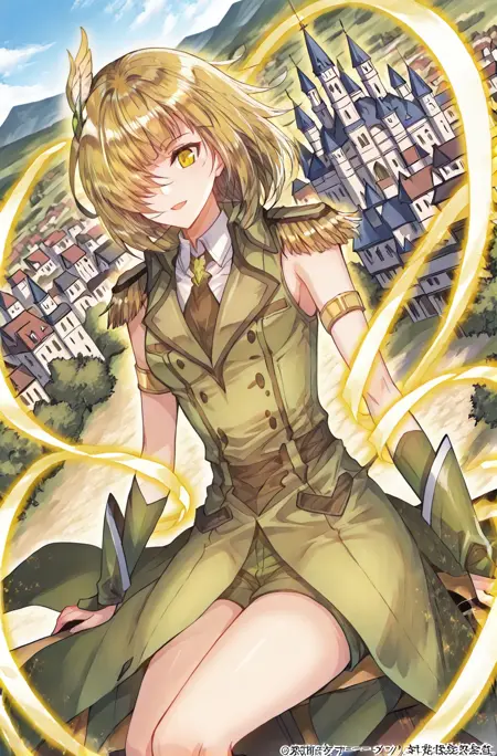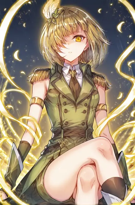 Mengdi_outfit, sleeveless olive green military tailcoat, double‑breasted, dark lapels, gold epaulettes, long front slit, maroon‑brown waistcoat, white shirt collar, green shorts, olive forearm guards, gold upper‑arm band, white high boots