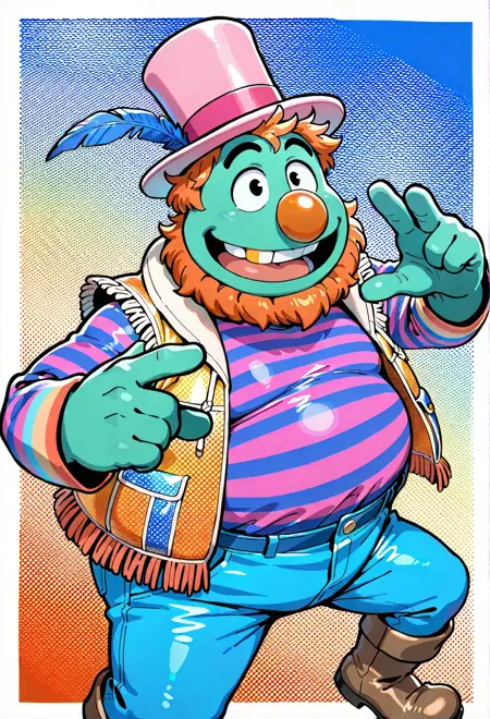 | トレーニングワード | DrTe3thTM, 1boy, green skin, large orange nose, shiny gold tooth, colorful outfit, pink top hat with a blue feather, striped shirt, fringed vest, blue jeans, moccasin-style brown boots, black eyes, orange hair, orange beard, fat, chubbyコピーしました! |