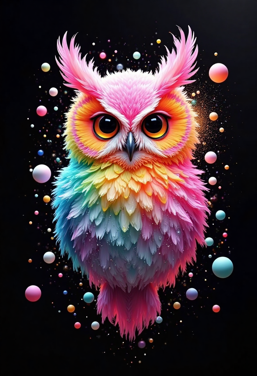 컬러풀한 플루이드 아트 스타일, 우주 여행을 하는 올빼미, 깃털은 컬러풀한 플루이드 그라디언트로 이루어져 있고, 주변에 별빛 구체들이 떠 있으며, 뒤에는 검은 우주가 펼쳐져 있습니다.