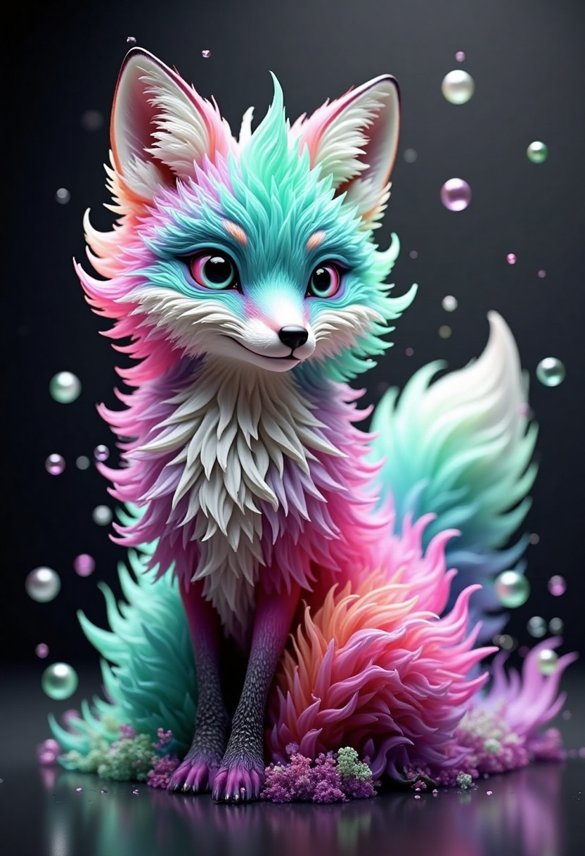 컬러풀한 플루이드 아트 스타일, 마법의 숲 여우, 털은 티얼, 핑크, 보라색이 혼합되어 있으며, 작은 거품이 떠다니고, 신비로운 야간 배경입니다.