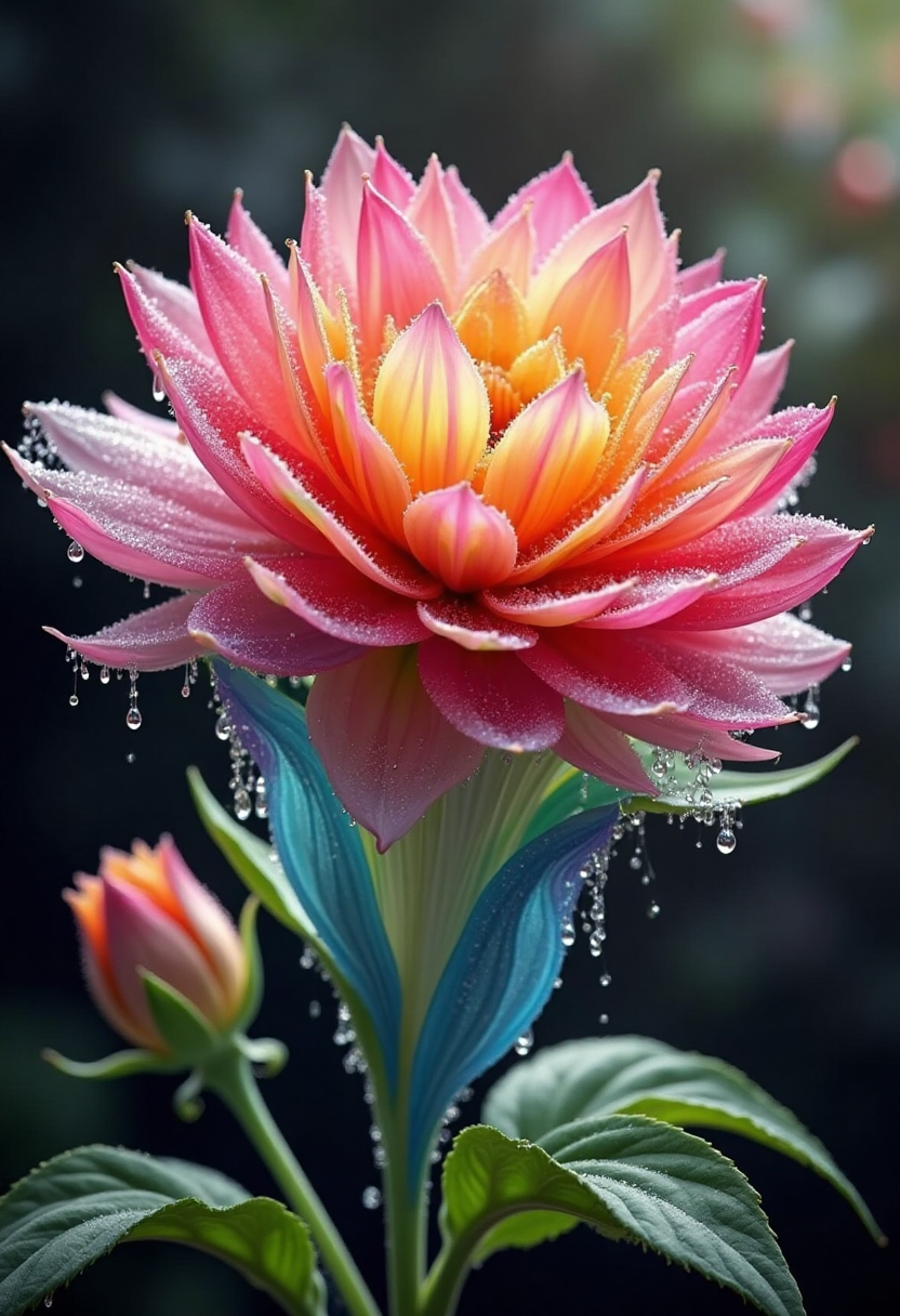 컬러풀한 플루이드 아트 스타일, 피어나는 꽃, 꽃잎은 다양한 밝은 색으로 이루어져 있고, 이슬방울은 반짝이는 구체처럼 보이며, 흐릿한 정원 배경입니다.
