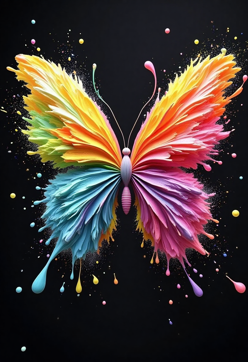 컬러풀한 플루이드 아트 스타일, 무지개 날개를 지닌 나비, 날개는 컬러풀한 플루이드 스플래시처럼 펼쳐져 있고, 꽃가루 알갱이는 작은 구체처럼 보이며, 어두운 초원 배경입니다.