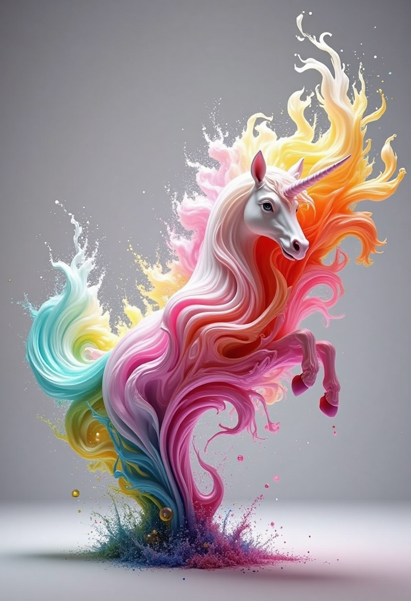 컬러풀한 플루이드 아트 스타일, 날아다니는 유니콘, 털은 색색의 유동적 흐름으로 이루어져 있고, 반짝이는 거품이 뒤를 따르며, 회색 하늘을 배경으로 합니다.