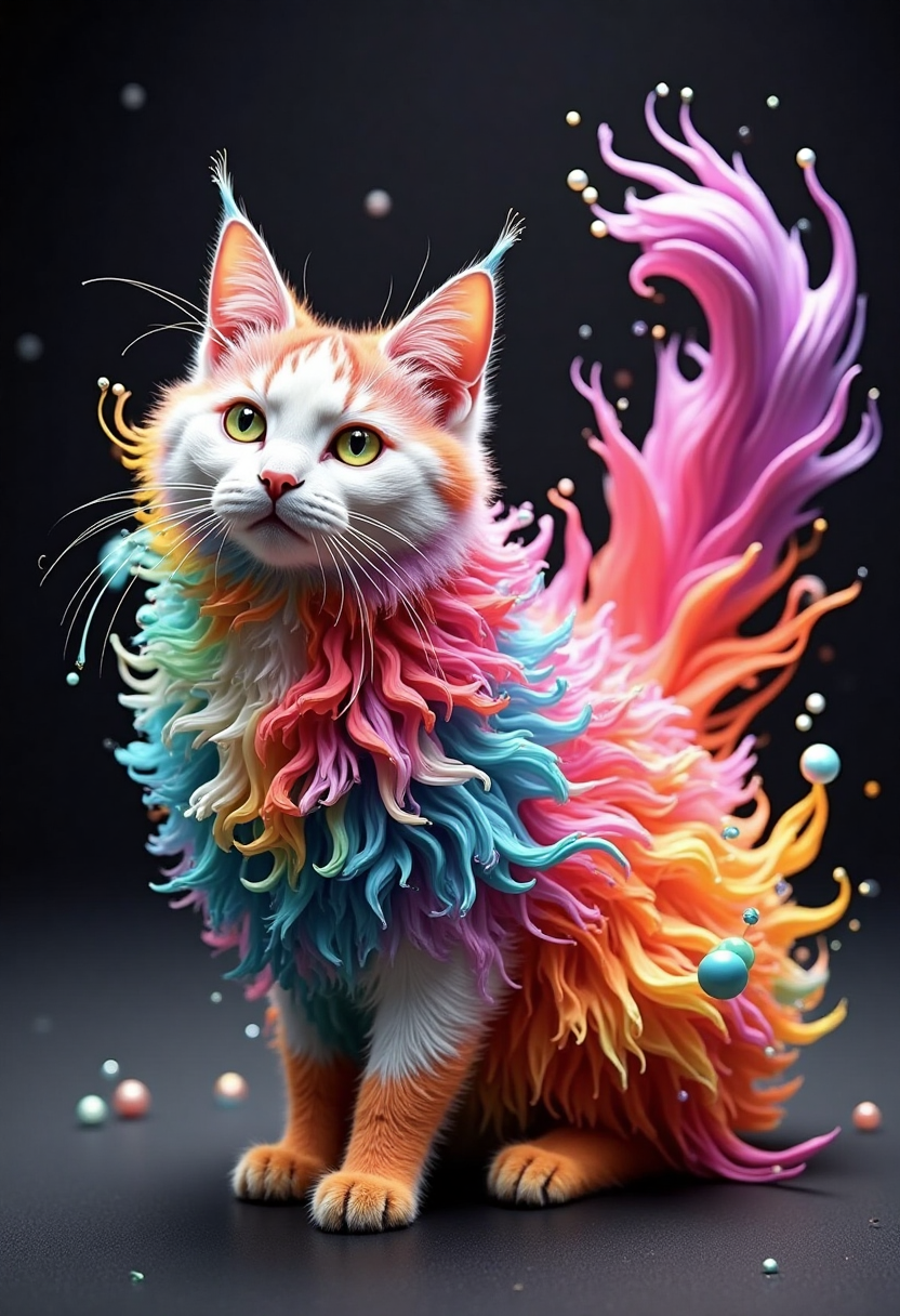 컬러풀한 플루이드 아트 스타일, 마법의 고양이, 털은 다양한 색상의 플루이드 패턴으로 뒤덮여 있고, 작은 빛 구체들이 근처에 있으며, 어두운 방 분위기입니다.