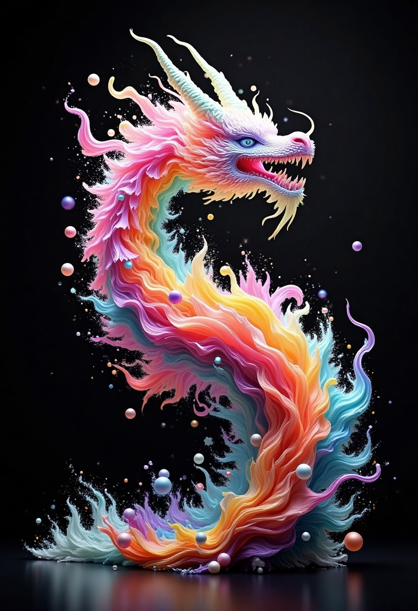 컬러풀한 플루이드 아트 스타일, 천상의 용, 몸체는 다양한 색상의 유동적인 흐름으로 구성되어 있고, 별처럼 빛나는 구체들이 주변에 떠 있으며, 검은 우주 배경입니다.