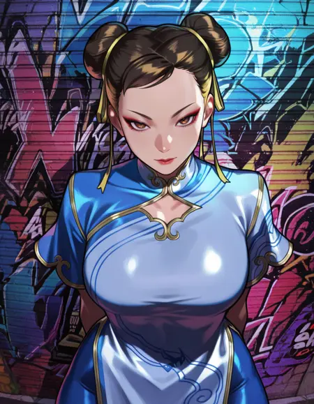 chun li, double bun, brown hair, brown eyes, - bangs, - will differ based on attire lora