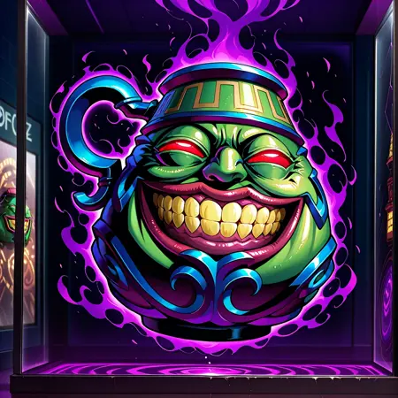 pot of greed, pot, blue handle, red eyes, red sclera, red lips, solid eyes, yellow teeth, squinting, green skin