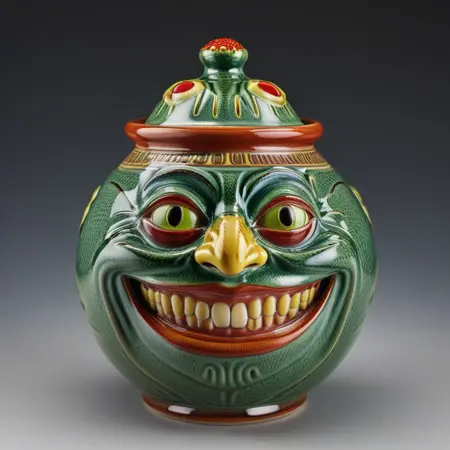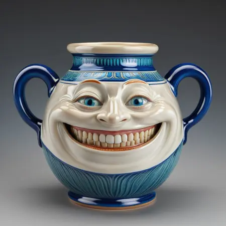 pot of greed, pot of avarice, pot of acquisitiveness, pot of generosity, pot of benevolence, jar of greed, jar of generosity, jar of avarice, jar, vase, pot, pottery, handle, handles, (Color) eyes, (Color) sclera, (Color) lips, solid eyes, (Color) teeth, squinting, (Color) skin,