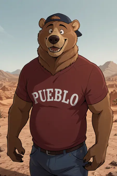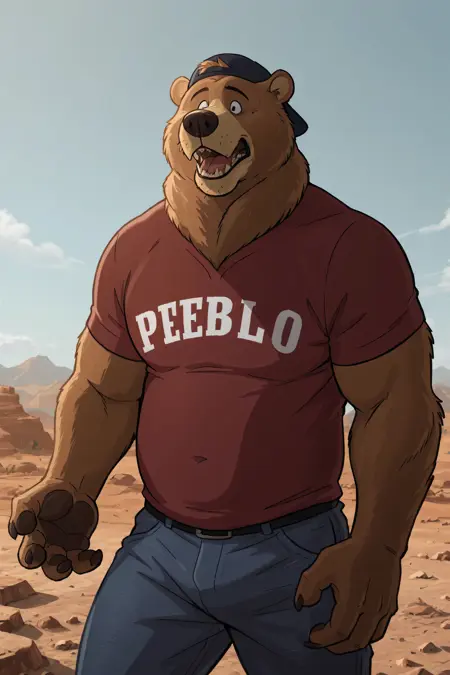 Devon触发词 - devon, 熊, 红色衬衫, 衬衫上的PUEBLO文字, 棒球帽, 蓝色长裤