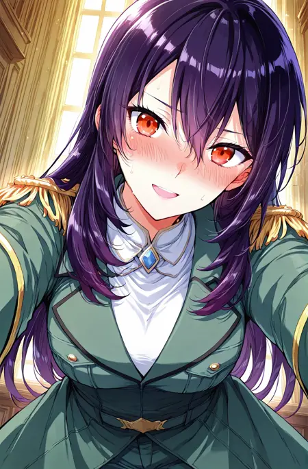 Yaner, 1 girl, solo, long hair, dark purple hair, side bangs, hair between eye, gradient red-orange eyes,