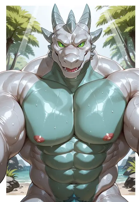 ShiningSaber, dragon anthro, white scales, green sclera, blue slit pupils,