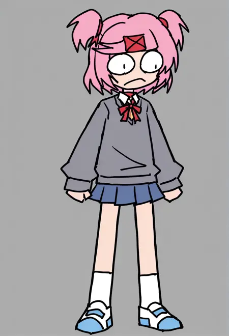 NeatuskiFNF, 1girl, uneven black eyes, pink hair, two side up, hairclip, x hair ornament, dark gray sweater, blue skirt, white socks, white-blue shoes, flat color, red neck ribbon