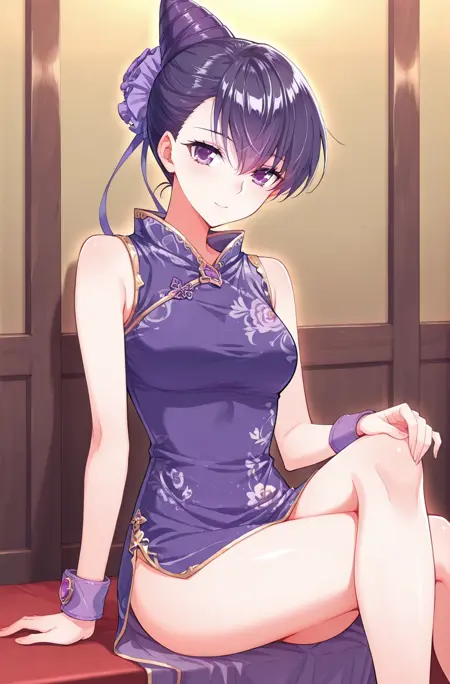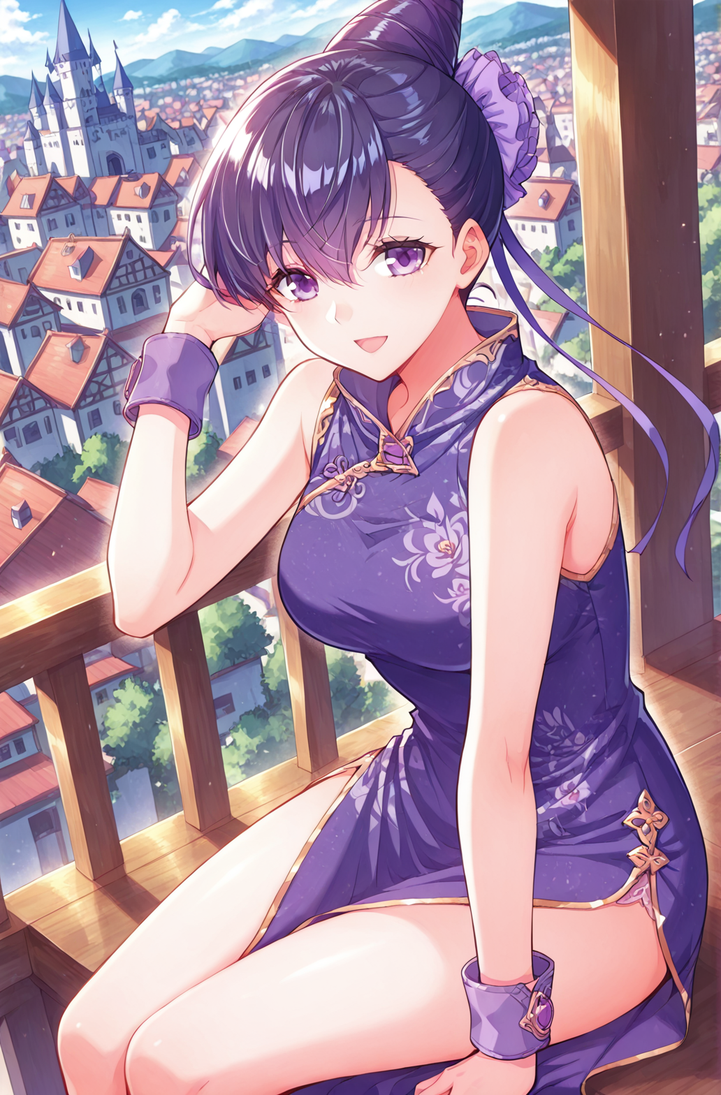 Qing, 1 girl, solo, dark purple hair, high wrapped bun, large purple hair bow, purple hair ribbon, side‑swept bangs, loose front strands, hair between eye, purple eyes,
