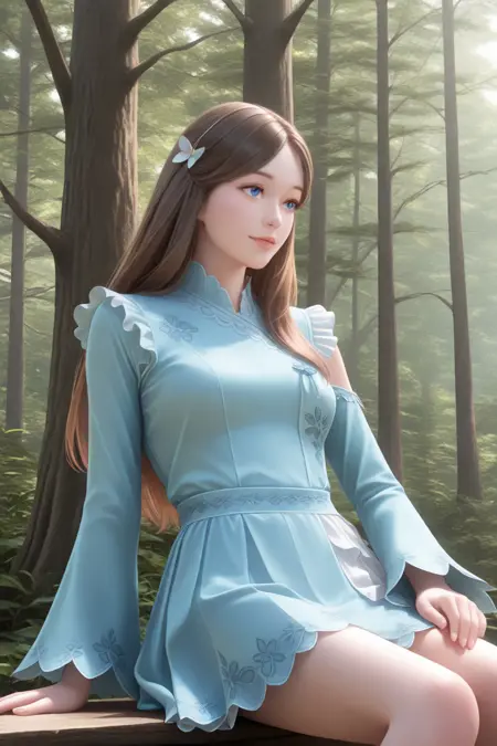 1girl, brown hair, light blue outfit, ruffled sleeves, floral patterns, short shorts, small skirt, delicate lace details,