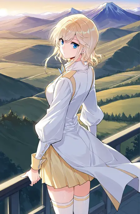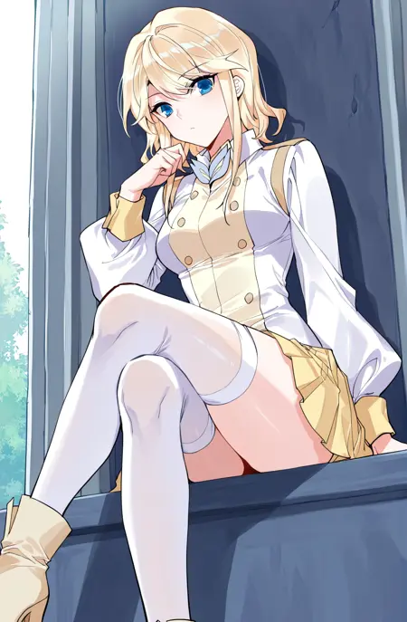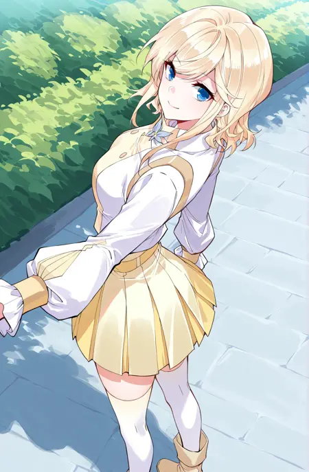 Weina_outfit, white high‑collar top, gold trim, puffy long sleeves, yellow cuffs, yellow pleated skirt, white thighhighs, beige ankle boots, blue gem brooch, gold shoulder tabs