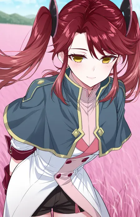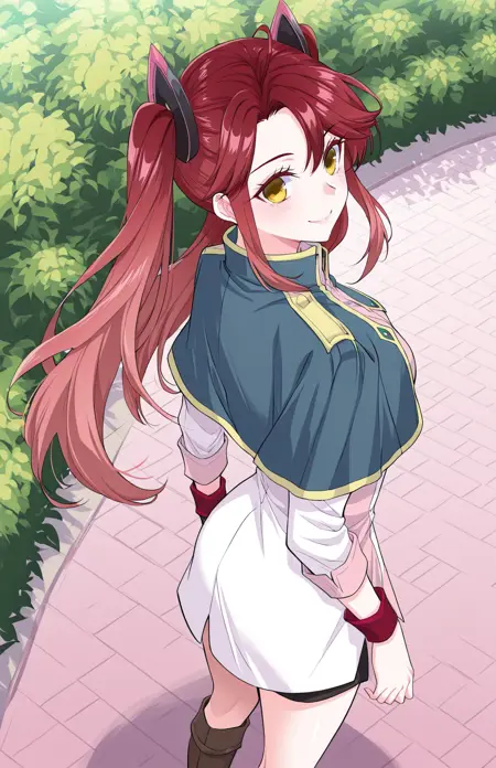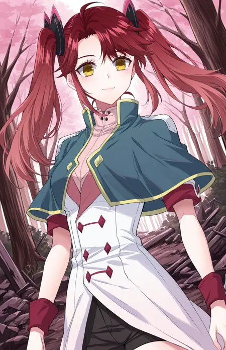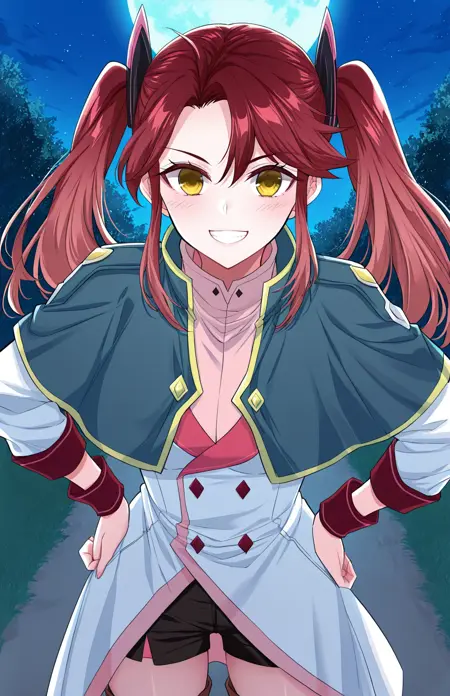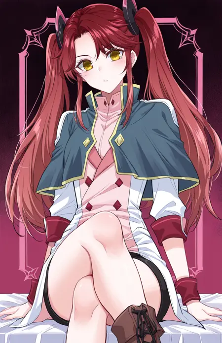 Keke, 1 girl, solo, long hair, red hair, twin tails, side bangs, long front strands, long sidelocks, yellow eyes,