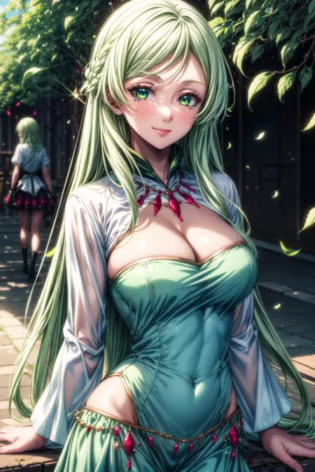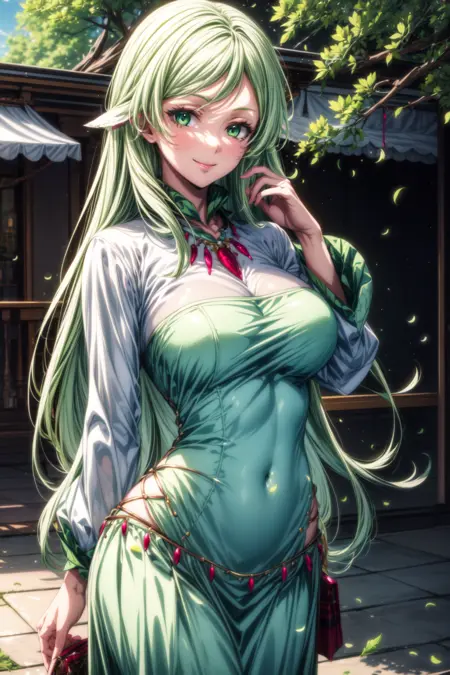 TreyniTensuraNDV, 1girl, large breasts, very long hair, green dress, necklace, jewerly, petals, vines, leaf, under-eye marks