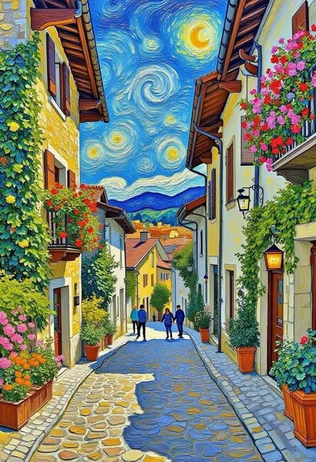 梵高风格油画,古镇的狭窄街道,石板路,爬满藤蔓的建筑,人们在星空下漫步。