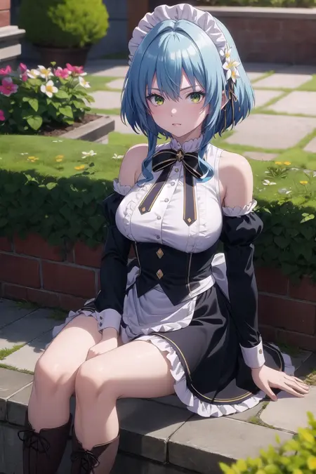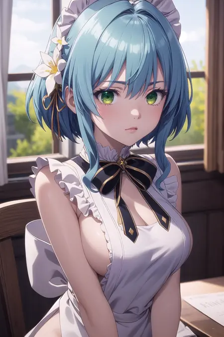 캐릭터 트리거: villhaze, 1girl, 파란 머리, 단발, 앞머리, 초록 눈, 눈 사이 머리카락, 머리 장식, 메이드 헤드기어, 머리카락 꽃, 옆머리, 중간 사이즈 가슴