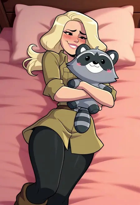 1woman,solo,female focus,Professor Svankmajer,blonde hair,long hair,black eyes,winged eyeliner,pink lips,black eyebrows,mature,breasts,slim,curvy,paleontologist outfit,belt over shirt,black leggings,calve high boots,