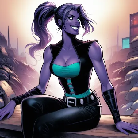 (섹시하고, 흥분을 자극하는, 뜨거운,) (여자만, 단일 초점) 아카오니, 오니, 색칠된 피부, 보라색 피부, 두꺼운, 왼쪽과 오른쪽 측두부에서 비스듬히 돌출된 염소처럼 생긴 뿔, 단일, 가시 위에 앉아 있음