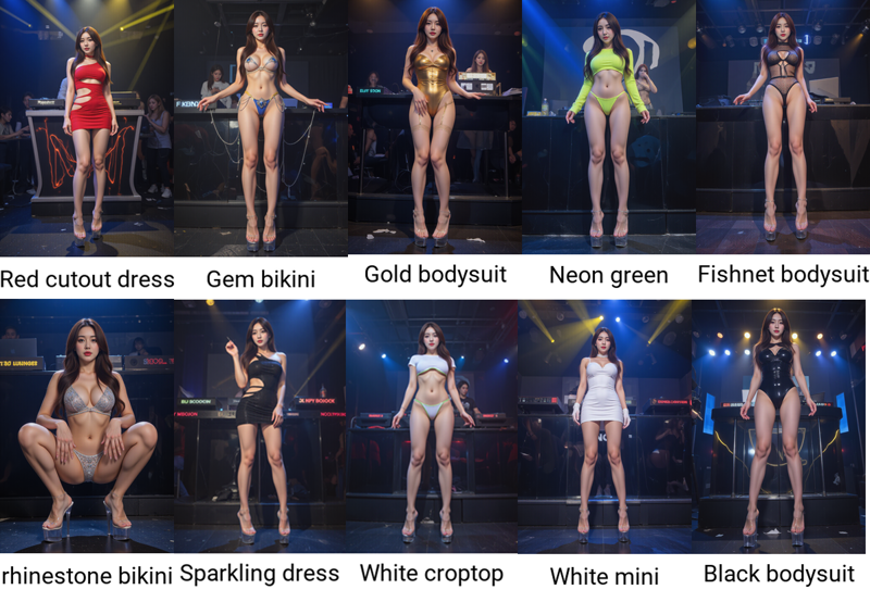 14 张图片根本不足以学习一些复杂衣服的细节,比如心形比基尼的细细的系带。而 Gem Bikini 大概率是因为 Girl-in-scene 数据集图片中有类似的银色链条+钻石的 rhinestone bikini,它能得到一定程度的有效学习和复现,但是很容易复现为 Girl-in-scene中的 rhinestone bikini 比基尼样式。至于款式较为简单的服装,模型更多的是从 GIrl-in-scene 中图片中去学习相应的服装,而从这个款式的一两张图片中学习到的特征很少。