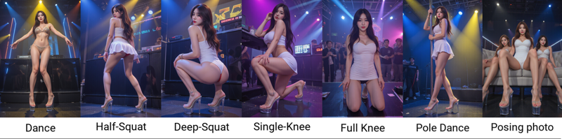 kneeling,( full kneeling, both knees down):1.3, (knees on ground:1.2), (sitting on calves:1.1), hand on thigh, static pose舞杆