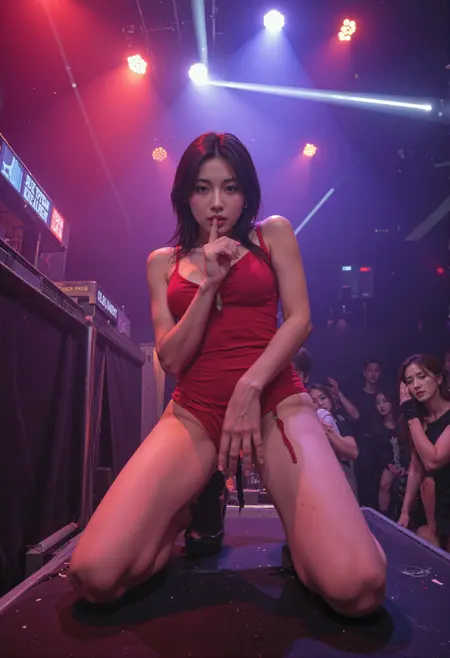 nightclub,nigtclub's stage,stage, elevated square platform, (very high square platform:1.3),peole in background gathered ((below the elevated platform):1.4), surrounding it and ((looking at girl):1.4), at the base of the stage.nc_scene